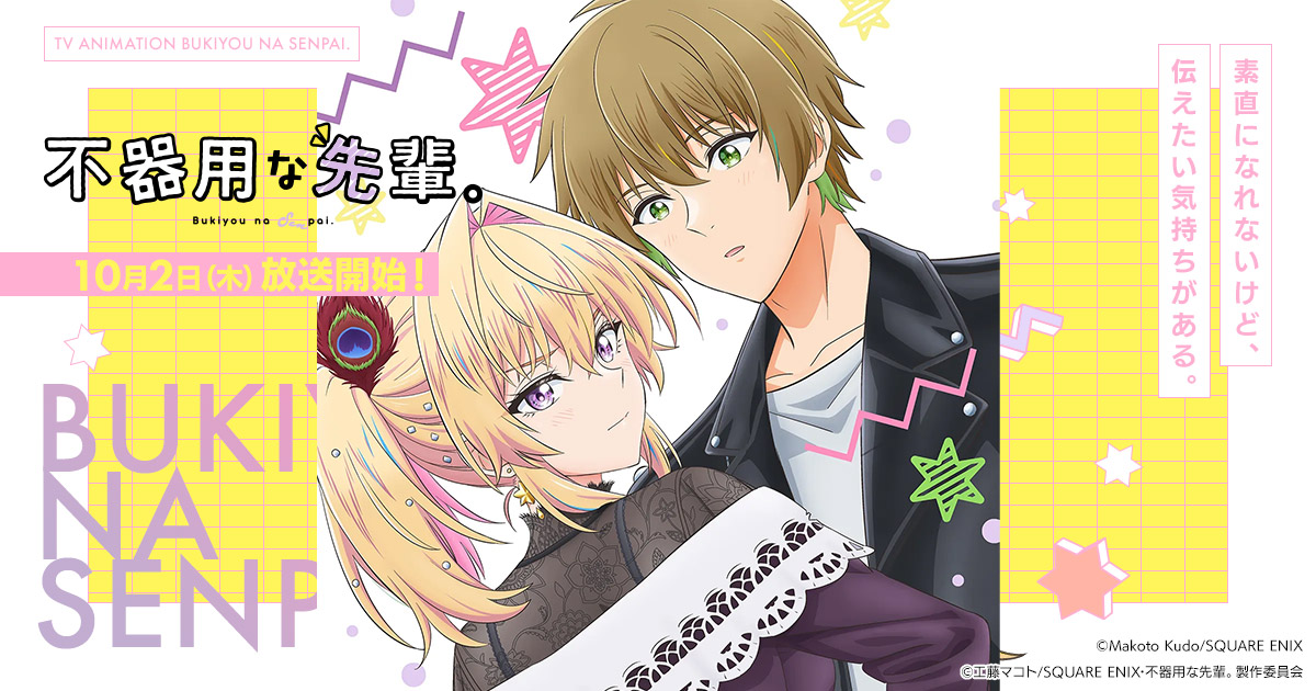 ヤングガンガンで連載中の漫画「不器用な先輩。」(工藤マコト)ですが、アニメ第1期が2025年10月3日からTOKYO MX、BS日テレで放送される予定です。