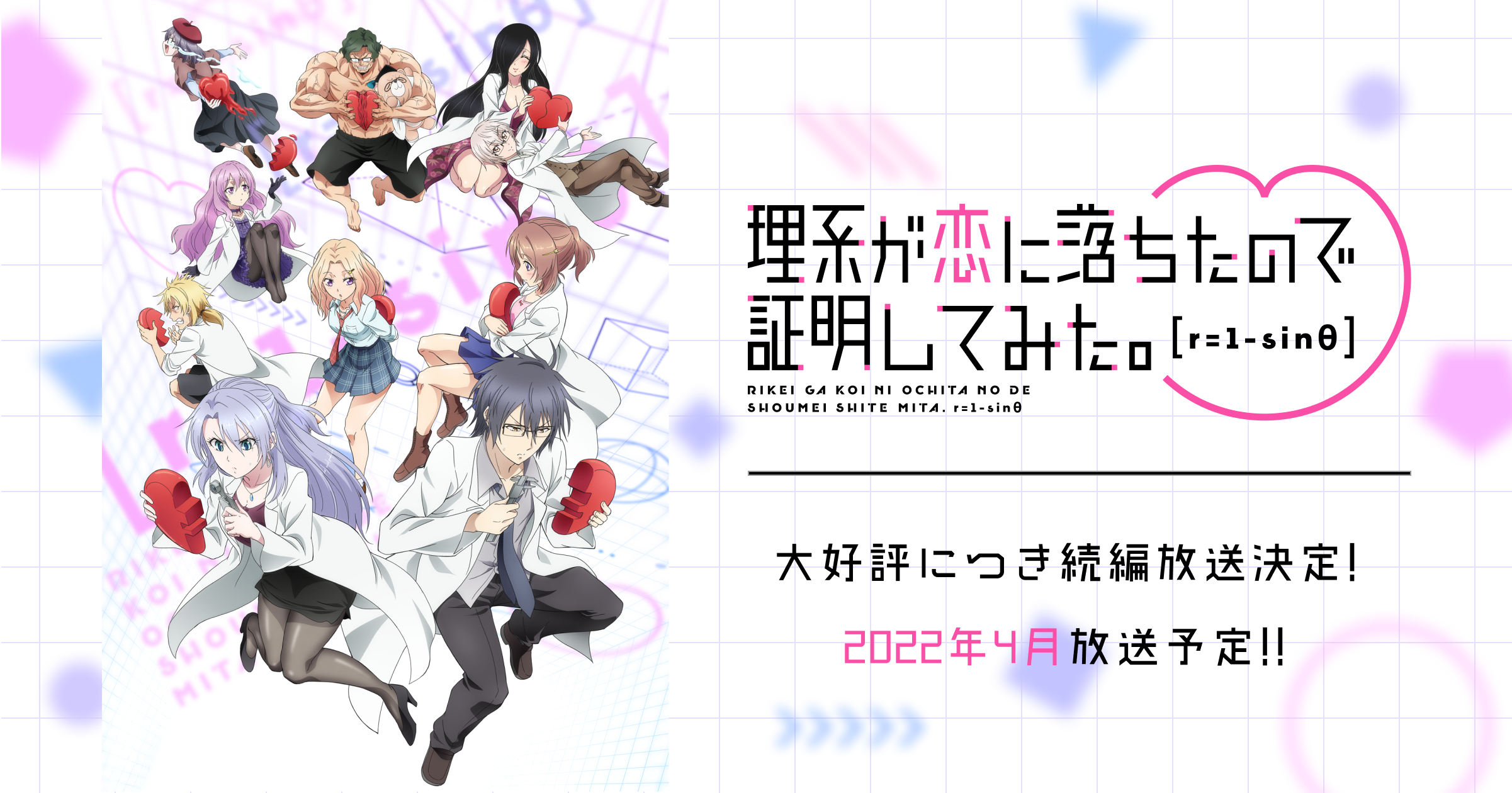 COMIC メテオで連載中の漫画「理系が恋に落ちたので証明してみた。」(山本アリフレッド)ですが、アニメ第2期にあたる「理系が恋に落ちたので証明してみた。r=1-sinθ」が2022年4月から6月までTOKYO MXほかで放送されました。