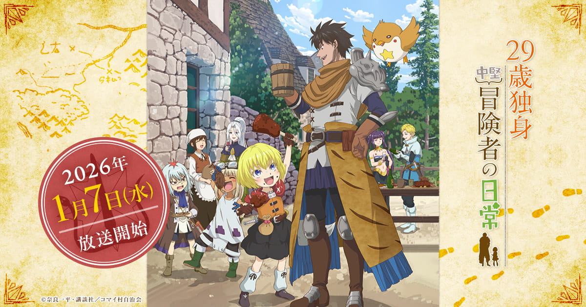 別冊少年マガジンで連載中の漫画「29歳独身中堅冒険者の日常」(奈良一平)ですが、アニメ第1期が2026年1月から放送される予定です。