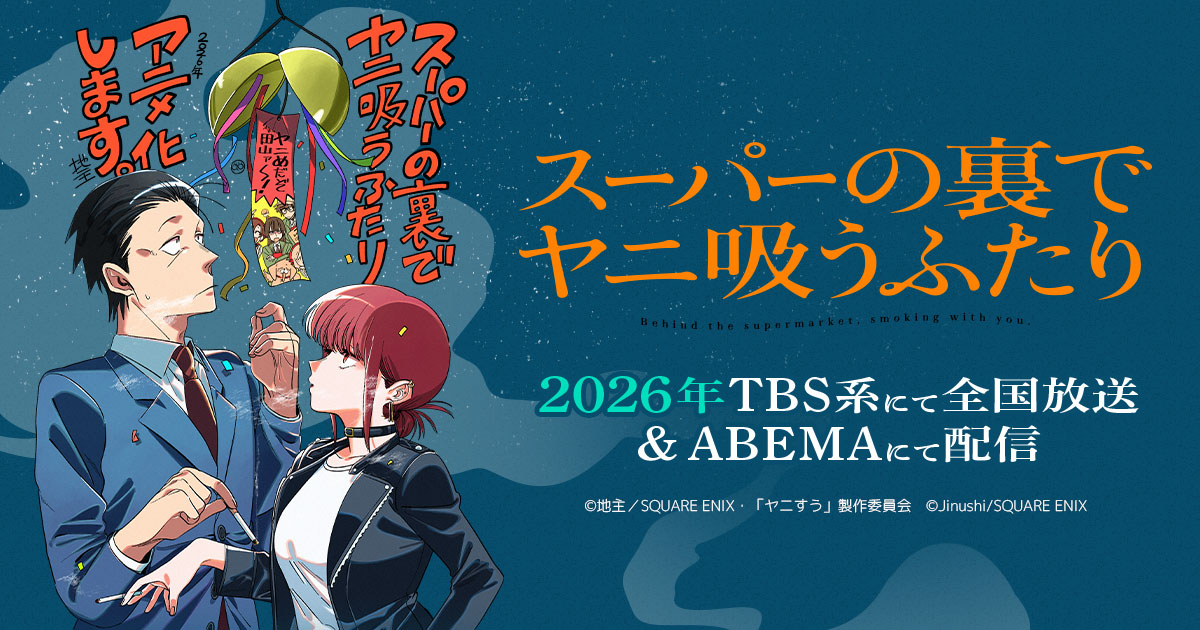 ビッグガンガンで連載中の漫画「スーパーの裏でヤニ吸うふたり」(地主)のアニメ化が決定しました。アニメ1期が2026年からTBSで放送されます。